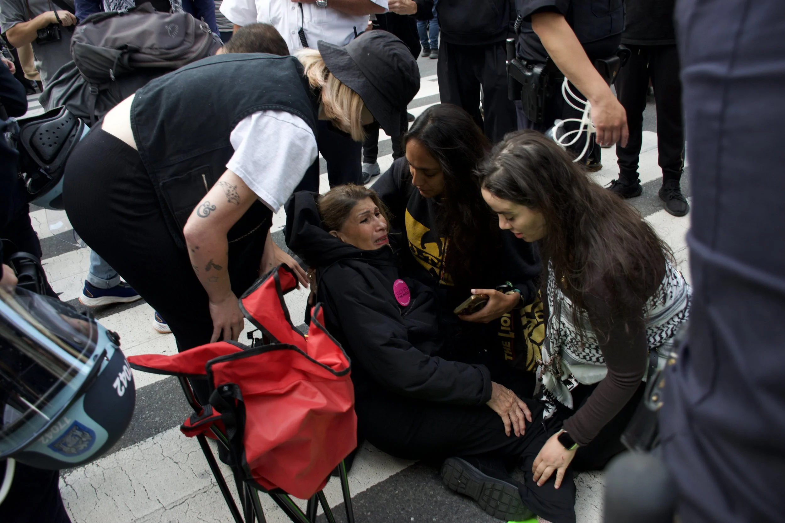 Protesters check in on a distraught activist, after being confronted by NYPD.